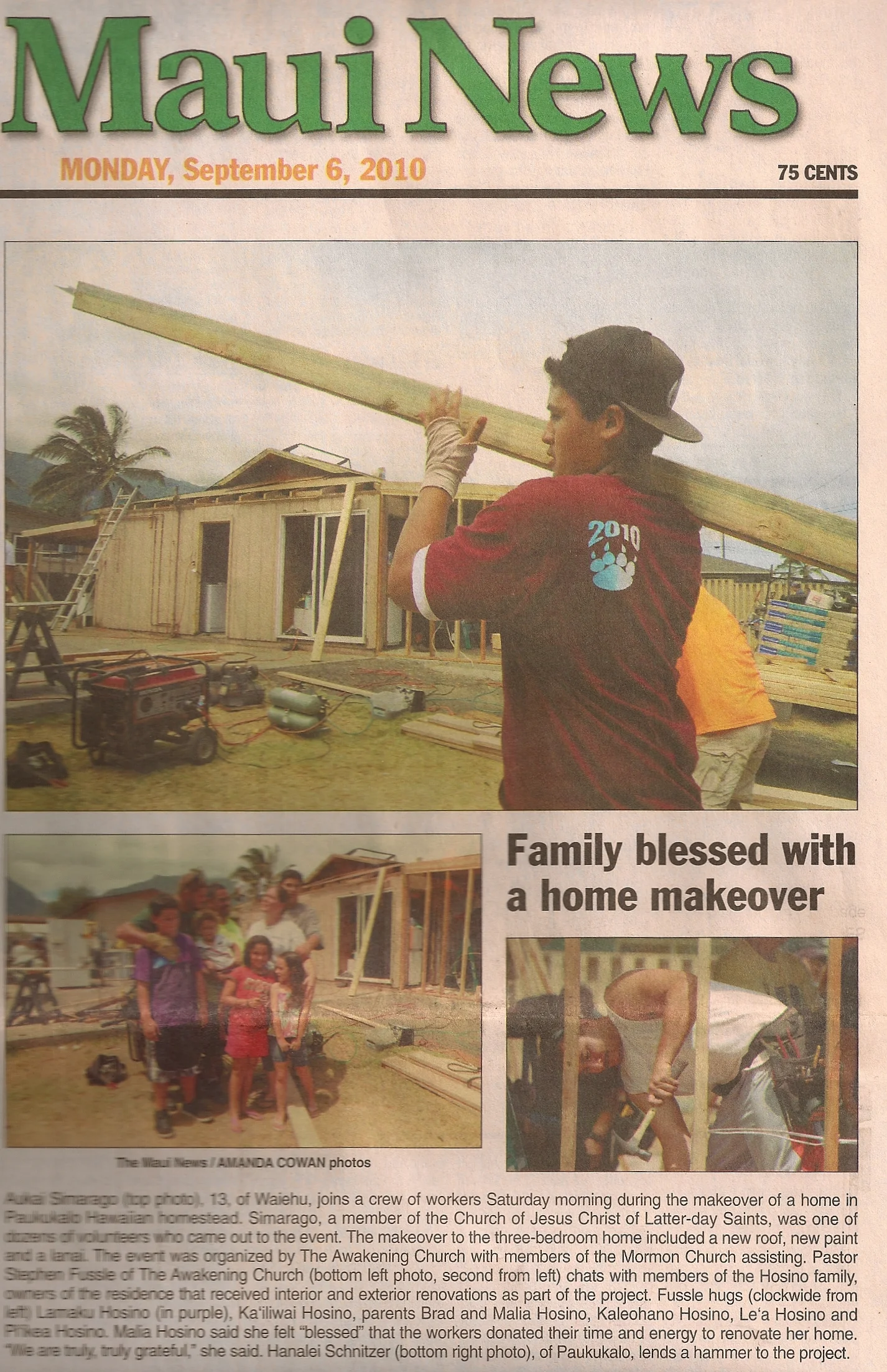 After encouraging his staff and congregation to participate in home makeovers for the less fortunate, they selected two homes over two years to renovate. With many man hours, donated material, and a lot of heart, The Awakening Ohana was able to complete 2 homes with over 1500 man hours and well over $50,000 worth of renovations. This included re-shingling, sealing roofs, re-plumbing, tiling bathrooms, painting, landscaping, and much more.